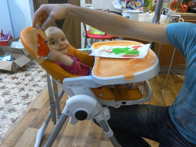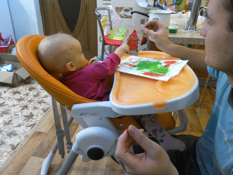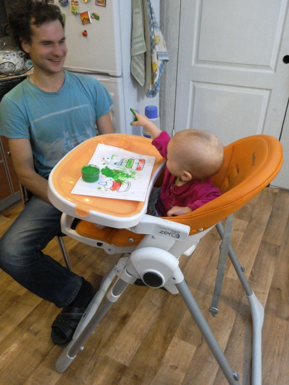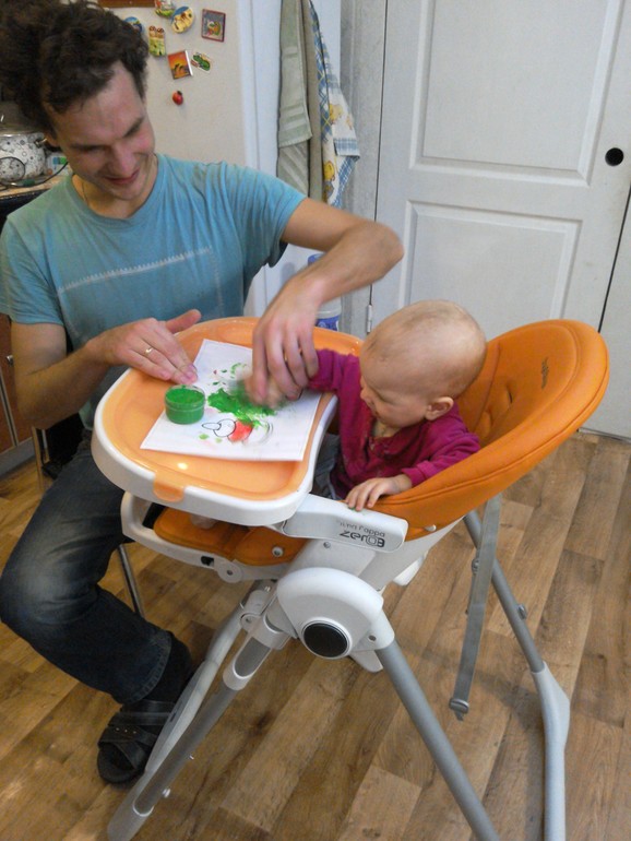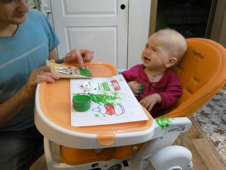 Ну,что сказать,родителям рисовать было очень весело))))Наш папа с упоением разукрашивал пирамидку и подавал дочке пример.Лизе это занятие по началу совсем не понравилось,она потянула в рот пальчик с краской,а она очень горькая (видимо специально,чтобы дети не ели) и конечно же мы устроили истерику.Пришлось помыть ей рот,это ей ещё больше не понравилось.Но потом, успокоившись,она с интересом стала наблюдать за папой и даже сама приняла участие в этом действии.Краску больше мы в рот не тянули.Правда испачкались сами и стул и стол и одежда.Кругом эта краска.То ещё испытание маме,но было очень весело наблюдать за мужем и дочкой,это стоит того беспорядка,что они мне устроили