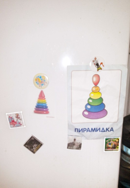 Ей они очень понравились,она сразу же полезла их снимать,чтобы " помусолить" в руках.Я дала ей их повертеть и потом принесла настоящие пирамидки.До этого дня у неё была пластмассовая пирамида с большими кольцами,а тут я решила достать ей ещё и деревянную ,но маленькую,чтобы было как на картинке большая и маленькая пирамидка.Увидив новую интересную игрушку она очень обрадовалась и потянулась к ней,я тем временем читала ей стишок.Не уверена,что она его уж очень слушала)все внимание было привлечено к новой пирамидке.В общем минут 15 я дала ей поиграть с ней,она как всегда собирала ее,как хотела.Но там довольно сложная пирамидка,по размеру колечки практически одинаковые.