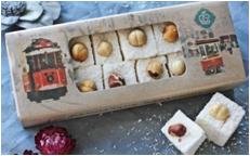 20. Лукум царский с фундуком, фасовка по 200гр. Коробка №3(прямоугольная, вытянутая с ретро трамваем), 89 руб.