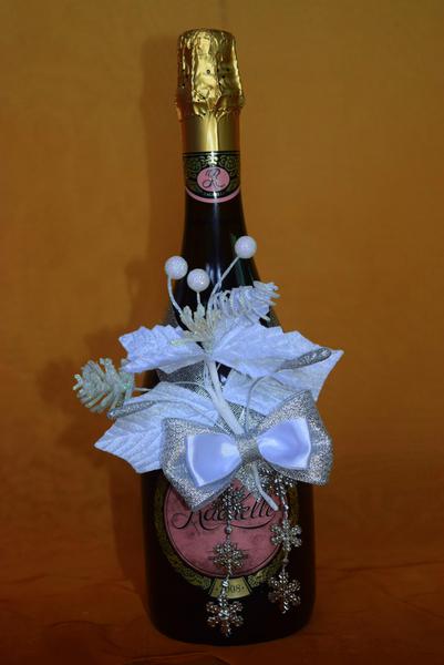 Очень удобно, потому что съемное и подходит на любую форму бутылки. Придумалось два воротничка.Одну я со знакомой шоколодницей сделала в пару к зимнему сладкому букету.