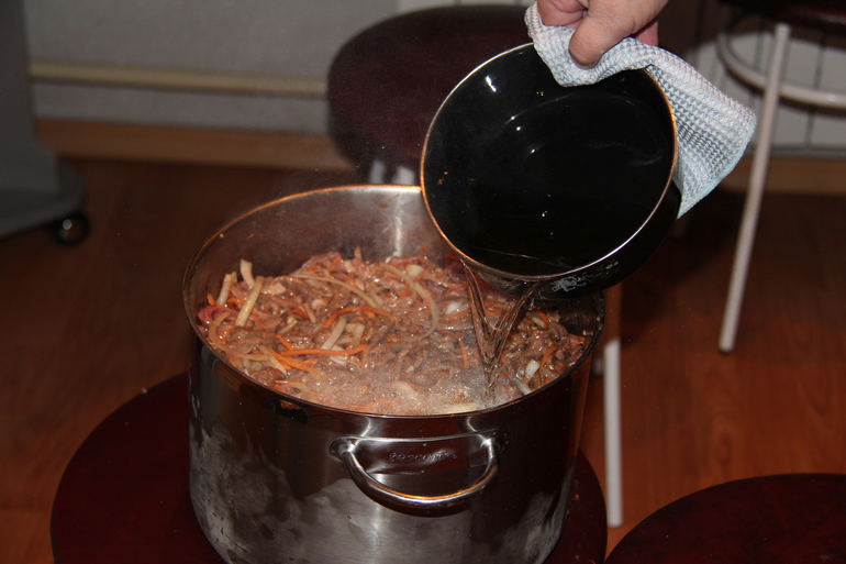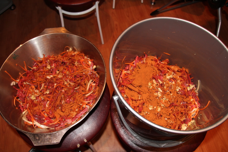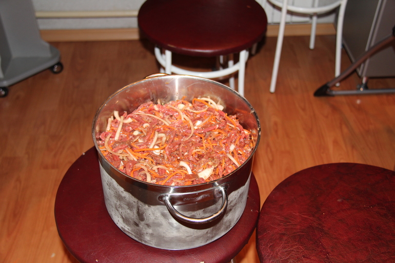 )мы вот разделили половину в ведро пищевое,а половину в этой миске оставили мы перемешиваем хорошо мясо,морковь,лук,солим по вкусу,перчим красным молотым перцем,мы любим остренькое чтоб было и добавляем уксус по вкусу