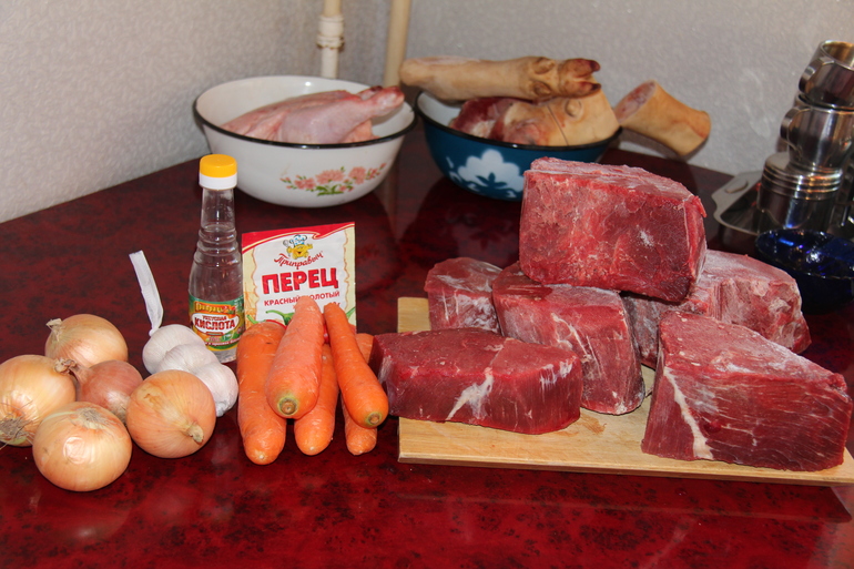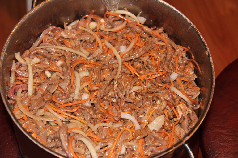 Для его приготовления нужно взять отличного качества говядину,чем меньше жил,тем мягче и вкуснее будет мясо,лук,морковь,соль,красный молотый перец,чеснок и растительное масло.Вот и все ингридиенты,но........какая вкуснятина.Попробуйте,не пожалеете.