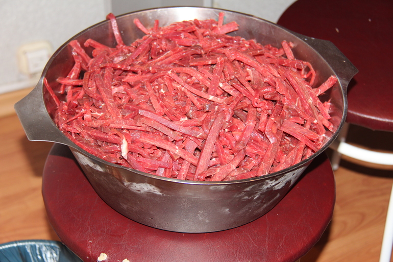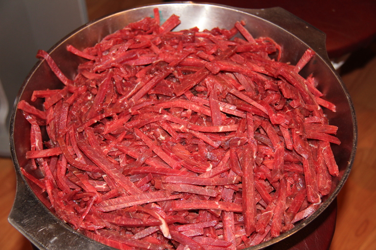 Вот видите мы резали мясо в металлическую миску и по боку миски образовался иней,такое холодное подмороженное мясо.Вот такими полосочками оно должно быть нарезано.Мы всегда его делаем очень много,потому что даже тот кто по какой-то причине не смог прийти ко мне в гости 31 и 1(потом мяса уже нет,это первое что всегда съедают