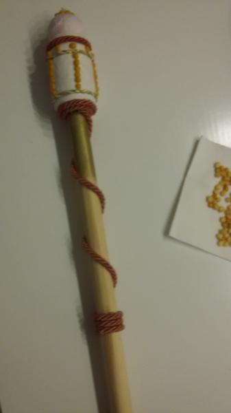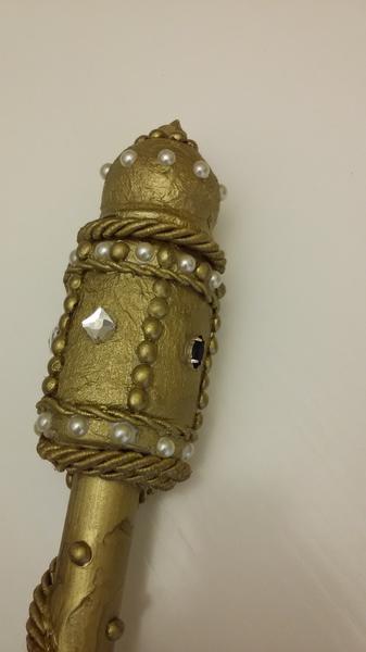 скипетр, например, верхушка-набалдашник сделан из пузырька из-под витаминов, сверху елочный шарик и все это в технике папье-маше задекорировано... далее облеено шнуром и ГОРОХОМ!))) , потом покрашено аэрозольной краской золотого цвета...