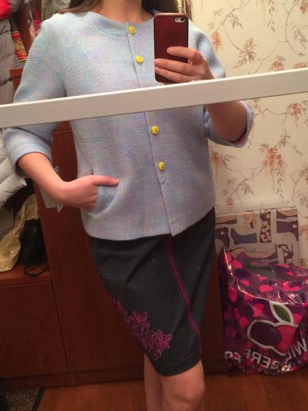 Жакет Эридан с ярко-розовой подкладкой) очень красивая голубая ткань с вкраплениями жёлтого и розового