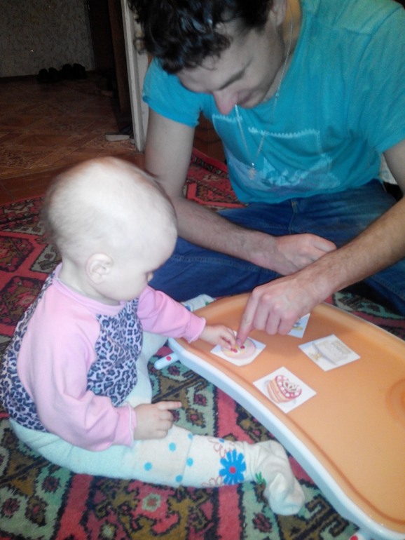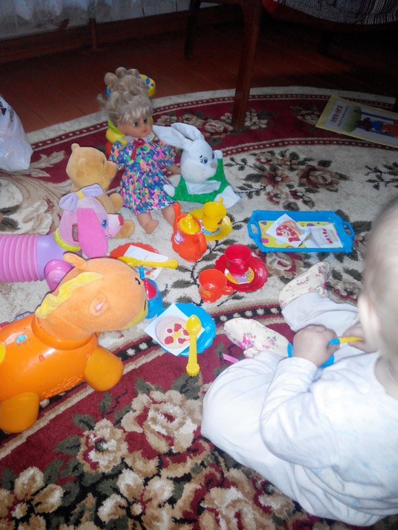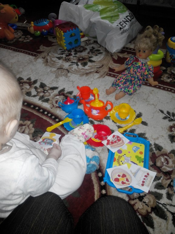 Я посадила куклу,прочитала Лизе стихотворение,она внимательно послушала.Я достала посудку и все внимание переключилось на неё.Приводить гостей она не стала,этим занималась мама.Я же поила гостей и кормила,а Лиза внимательно наблюдала,очень ей понравилось,как я их из кружек пою и кормлю угощением.Чаепитие продолжалось довольно долго,гости все ушли домой,Лиза особо не препятствовала,но вот когда я стала убирать посудку,были слёзы,пришлось доставать обратно.