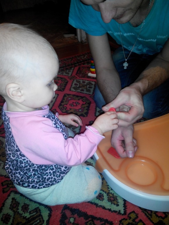Пластилин Лизе понравился сразу,с удовольствием прикрепляла кружочки,а потом мы ещё и разных зверюшек полепили,точнее лепил папа,а дочка с ними играла.