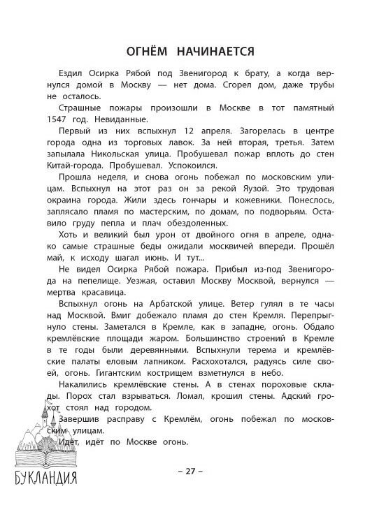 Простым и образным языком, занимательно и доступно автор рассказывает о жизни Ивана IV, получившего прозвище Грозный, о непростом и суровом времени его царствования. О детстве и юности царя Ивана, о военных походах и строительстве новых городов и храмов, о первой печатной русской книге и о первой географической карте, о завоевании Сибири Ермаком и о жестоких годах опричнины. А ещё ребята узнают, кто такие толмачи и откуда появилось слово копейка, что такое разбойный приказ, большой наряд и излюбленный голова и много других интересных сведений из эпохи далёкого прошлого.