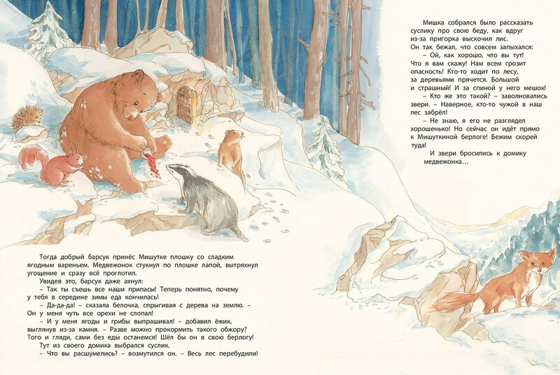 Очень трудно заснуть, когда хочется есть! И вот голодный Мишутка, вместо того чтобы спать в своей берлоге, отправился на поиски мёда и переполошил обитателей зимнего леса. И только мама-медведица смогла накормить, успокоить и уложить спать своего сыночка, а заодно и других лесных зверушек, потому что она – лучшая мама на свете!