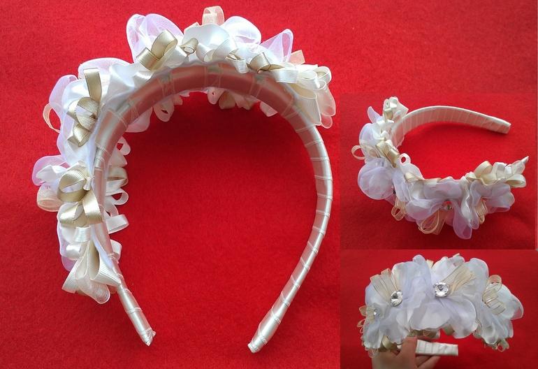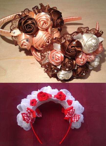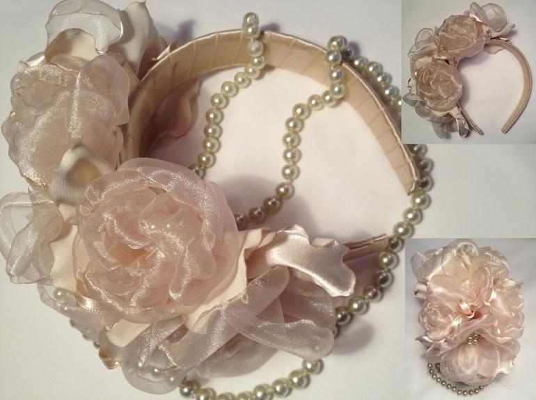 1 - Ободок с композицией из роз, кружева, страз. Цвета: персиковый в розовом цвете, шоколадный, жемчуг. Ободок каучуковый, не сломается. Цена 950 р.