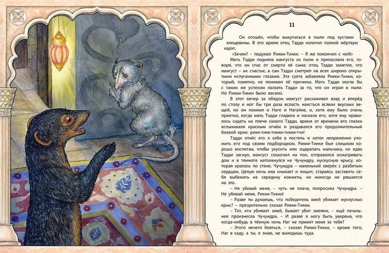 Это «рассказ о великой войне», которую в одиночку вёл Рикки-Тикки-Тави, отважный маленький мангуст. Он доблестно сражался с двумя кобрами, охраняя покой своих друзей. И после его победы ни одна кобра больше не решалась показываться за садовой оградой. Волшебные иллюстрации Виктории Денисовой прекрасно передают экзотический индийский колорит и героический дух знаменитой сказки Редьярда Киплинга.