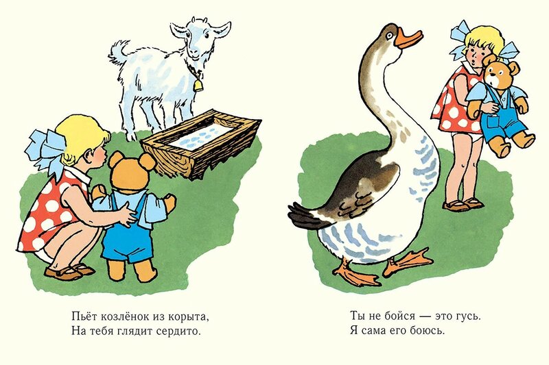 Как же здорово отправиться на прогулку вместе с плюшевым Мишкой! Можно познакомиться с курами и утками, чёрным Шариком и сердитым козлёнком и даже искупаться в речке.