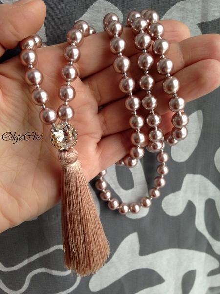Нежнейший сотуар - выполнен из глянцевого жемчуга Майорка, шелковой кисти и кристалла Сваровски. Также использован японский бисер. Фурнитура родирована.