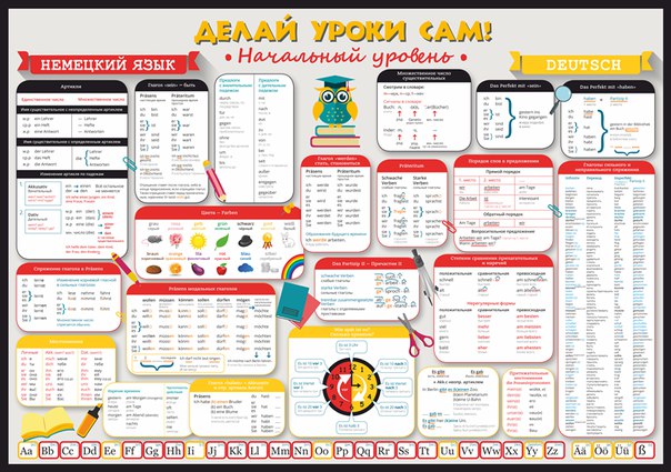 Плакат содержит все основные правила и конструкции немецкого языка, необходимые для начального уровня изучения языка (по школьным меркам с 1 до 5 класса).