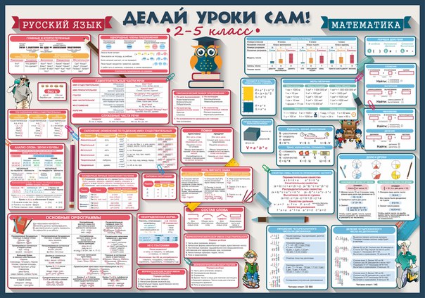 В плакате собраны, упорядочены и представлены в удобной форме все правила и формулы по русскому языку и математике, которые понадобятся ребенку и его родителям cо 2ого по 5ый класс при выполнении домашних заданий, а также после каникул в 5-м.