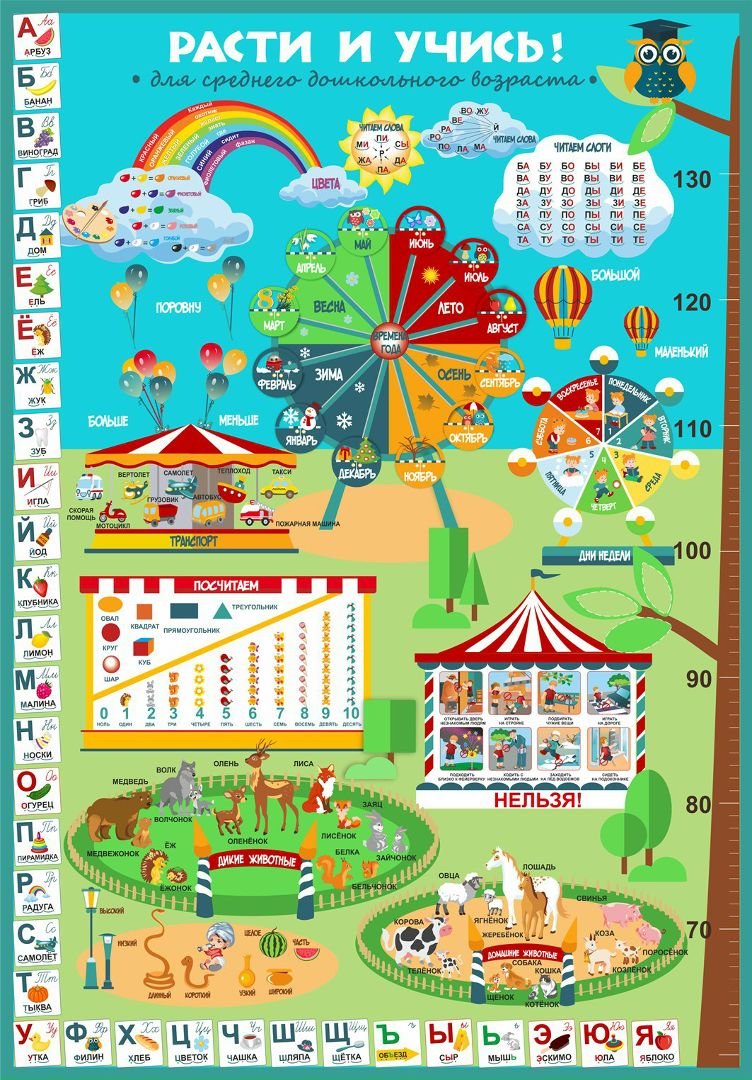 Занимаясь по материалам плаката ваш ребенок познакомится с основными цветами, временами года, временем суток, геометрическими фигурами, числами, объединением предметов в группы по определенным признакам, сравнению групп по количеству, некоторыми гласными и согласными звуками и азам чтения.