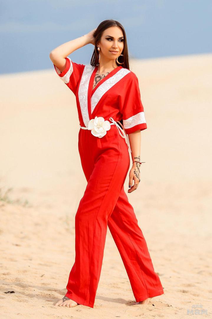 Летний комбинезон свободного покроя в романтическом стиле. Верхняя часть комбинезона- покроя кимоно. Полочки задрапированы на запах. Спереди на брюках – прорезные карманы и мягкие склады на талии. Верхняя и нижняя часть комбинезона соединяются притачным поясом, на котором нашиты шлевки. В боковом шве находится потайная молния. В комплекте- тканевой пояс.