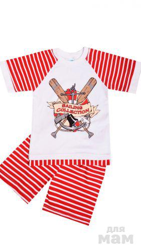 9.Яркий и практичный комплект для мальчика отлично подойдет для ежедневного использования. Он включает в себя футболку с коротким рукавом и шортики. Футболка белого цвета с отложным воротничком и застежкой на две кнопочки. Спереди модель украшена контрастными полосками и весёлой аппликацией. Свободные шортики красного цвета, на мягкой, эластичной резинке, не будут стеснять движений малыша. Мягкий и удобный комплект приятен к телу, "дышит" и не вызывает аллергии. Состав: 100% хлопок (45021)