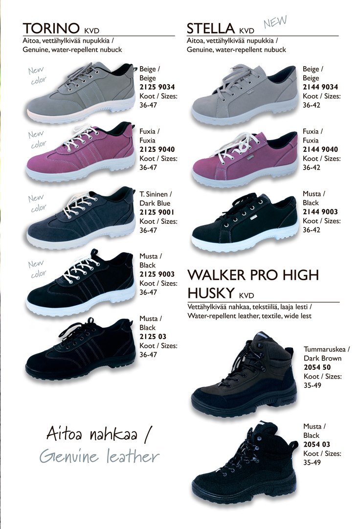 - Kuoma Stella арт.2144 цена 53 евро, размеры 36-42. Натуральный нубук, анатомически просторная колодка и амортизирующая подошва. Две стельки (Система KVD -дает возможность изменять внутренний объем обуви);