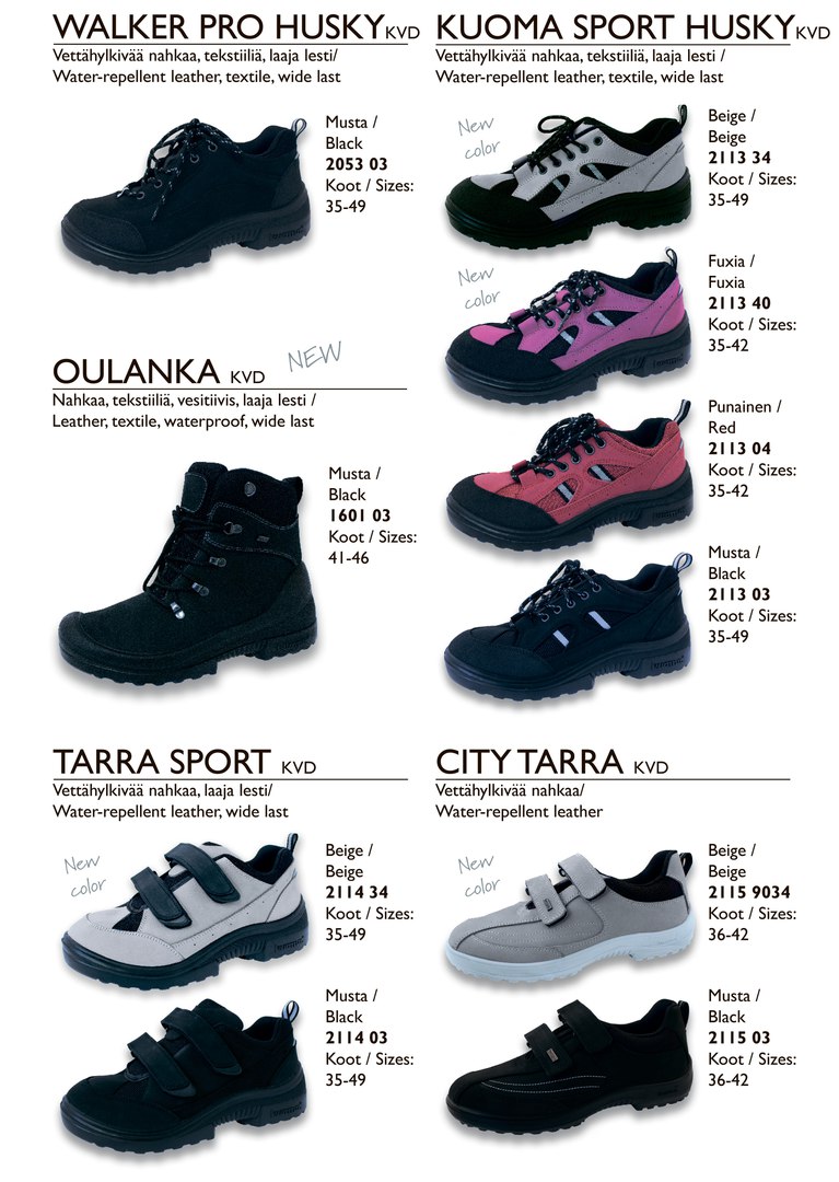 - Kuoma Sport Husky арт.2113 цена 48 евро (р-ры с 35 по 41), 50 евро (р-ры с 42 по 47) и 52 евро (р-ры с 48 по 49). Натуральная кожа и текстиль, анатомическая и широкая колодка, две стельки (Система KVD -дает возможность изменять внутренний объем обуви);