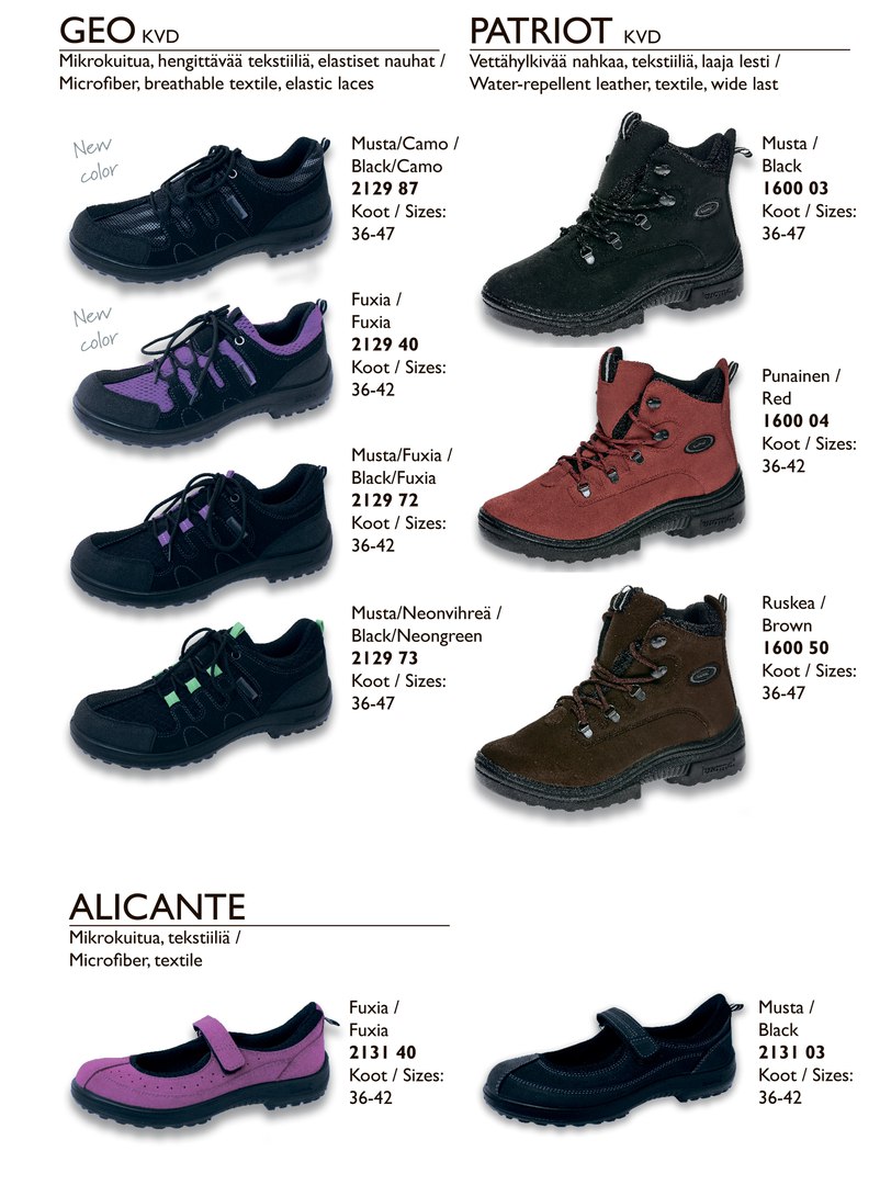 - Kuoma Tarra Sport арт.2114 цена 48 евро (р-ры с 35 по 41), 50 евро (р-ры с 42 по 47) и 52 евро (р-ры с 48 по 49). Натуральная кожа, легкие и долговечные. Для занятий физкультурой, отдыха и спортивной ходьбы. Две стельки (Система KVD -дает возможность изменять внутренний объем обуви);