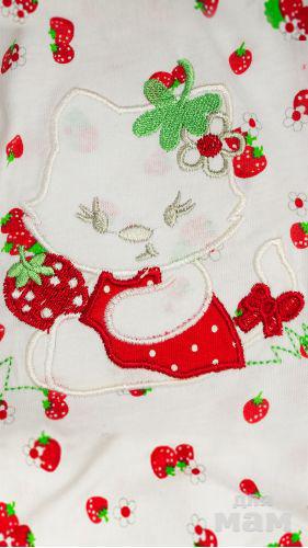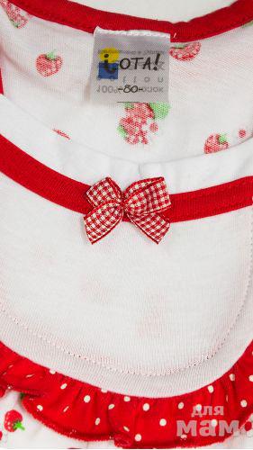 2. Очаровательная футболочка имеет трапецевидный крой и украшена оборочками и аппликацией-вышивкой. Горловина застегивается на плече на кнопочки, что облегчит процесс переодевания ребенка. Красные бриджи очень удобны и практичны в носке. Пояс штанишек выполнен в виде эластичной резинки, которая не сковывает движений, не сдавливает и не натирает кожу. В таком комплекте малышка будет выглядеть модно и красиво.