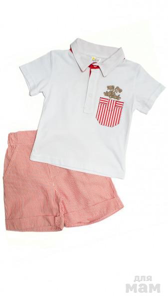 3.Стильный комплект из футболки и шорт прекрасно подойдет для прогулок. Хлопчатобумажная ткань очень приятна на ощупь и полностью безопасна для ребенка. В комплект входят стильные красные шорты с небольшими кармашками, на эластичном, широком поясе. Футболка "поло"с красивой аппликацией. Вашему малышу непременно понравится такой яркий и удобный комплект.