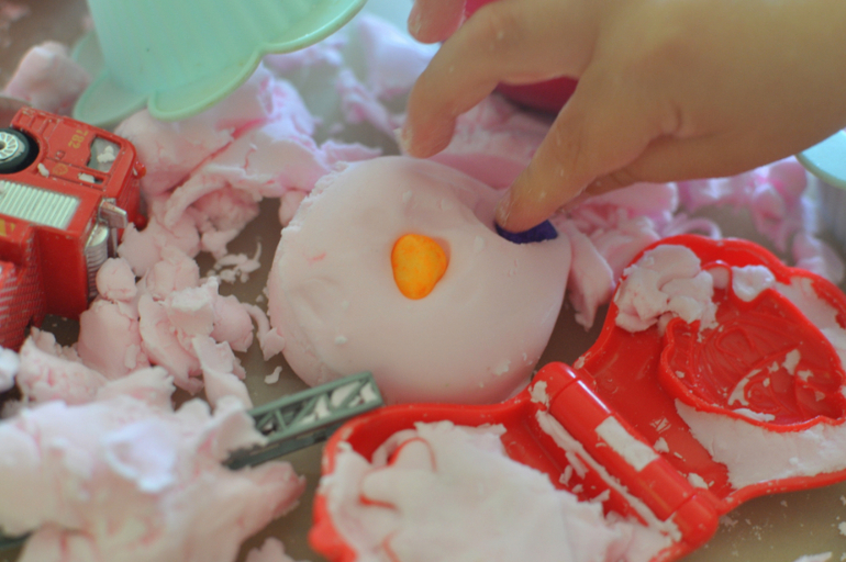 ...почему эти все смеси принято называть moon sand или cloud playdoh. Может потому, что масса получается действительно необычная для тактильного восприятия. Это не песок в привычном понимании, это не пластилин, это что-то между. Такое мягкое, при сильном нажатии протекающее скозь пальцы незаметно, нелипкое, но и не сыпающееся, шелковое, гладкое, легкое.
