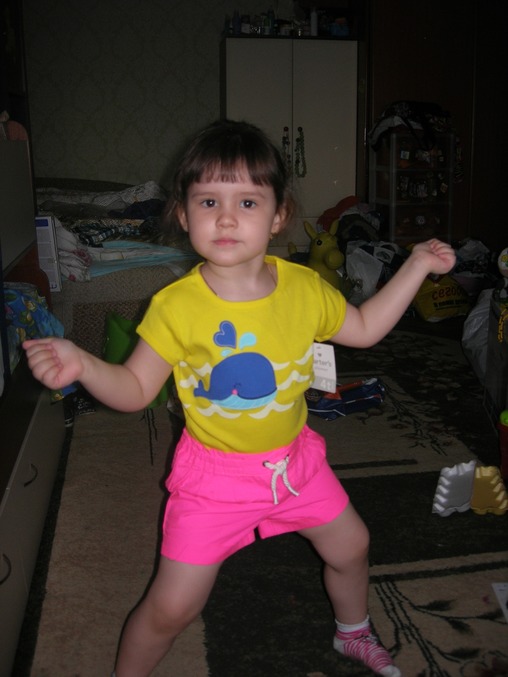 и шортики. Долго думала, что же лучше одеть наверх и в наших закромах нашлась футболочка ДС, по-моему, подходящего цвета