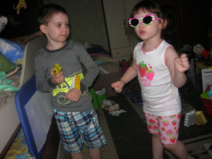 Шорты на Арсюшке размер 5т На Кристине пижамка,которую в жару можно одеть и как костюм.Клубнички блестящие. размер 5т И долгожданные очки!