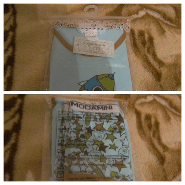 Сам материал 100% хлопок, гипоаллергенный. На ощупь очень приятный к телу, нежный такой. Расцветка гармоничная, маечка насыщенно-голубая с коричневой отделкой горловины и подмышек, на маечке принт в виде ракеты. А трусики -чума! На голубом фоне принт из ракет и звезд темно-, светло-коричневого и хаки цвета, эластичная широкая резинка с лейблом Modamini.