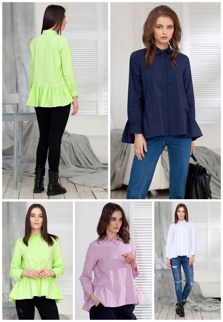 6. Свободная блуза из приятного однотонного хлопка поможет создать элегантный и демократичный образ. Аккуратный рубашечный воротник, длинные рукава на манжете, потайная застежка подчеркивают лаконичность кроя. Интересным дополнением служит баска в сборку по низу изделия.