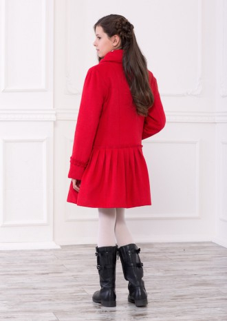 Стильное и нарядное пальто на холлофайбере для девочек темно-синего и красного цвета смотрится просто потрясающе. Горловина закрытая с маленьким отложным воротником, застежка двубортная на пуговицах. Талия занижена, а низ пальто в виде юбочки отлично садится на любую фигуру и смотрится оригинально и интересно. Полуприталенный силуэт отлично дополняет общий дизайн.