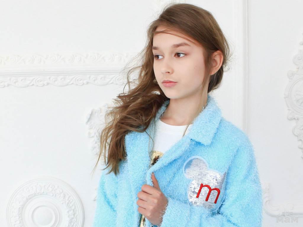 1684 пальто, мех искусственный, аппликация паетка лазурь 110-128 цена 36,45