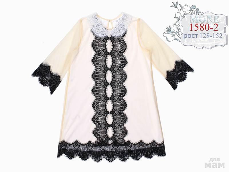 1580-2 платье евросетка, французские кружева, воротник бисер крем 128-152 цена 42,15