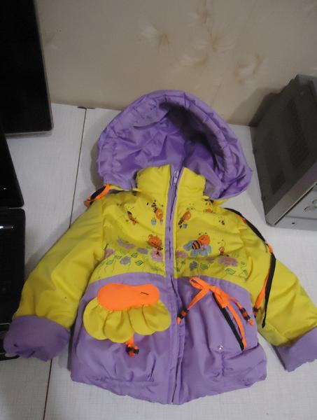 Полноразмерная,на тонком слое утеплителя,подкладка хлопок.Рукав от плеча 33 см.можно подвернуть и будет 28 см.По спинке 40 см,по снизу утяжки,по бокам кармашки,куртка и капюшон украшены крупными стразами,к сожалению на одном рукаве маленькая дырочка(((