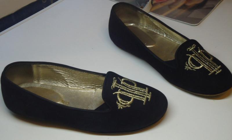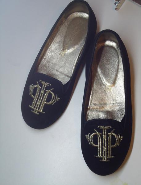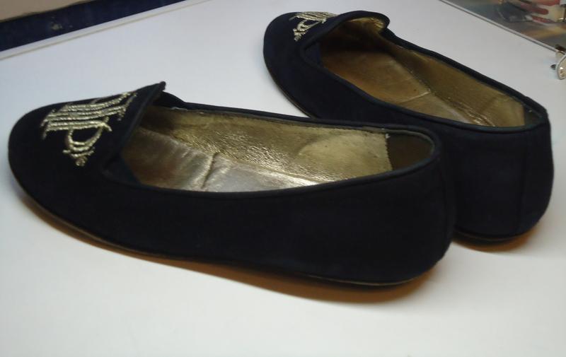 Лоферы из замши синего цвета,спереди вышит брендинг золотого цвета.