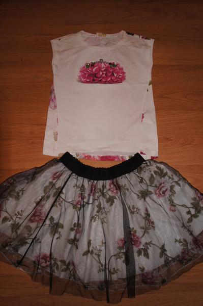 Футболка ф. Monnalisa серия Chic р. 10 - 1500 р. Юбка тройная, безымянная, "просто красивая" р. 140-146 см., пояс резинка, подойдет под разный размер. - 800 р.