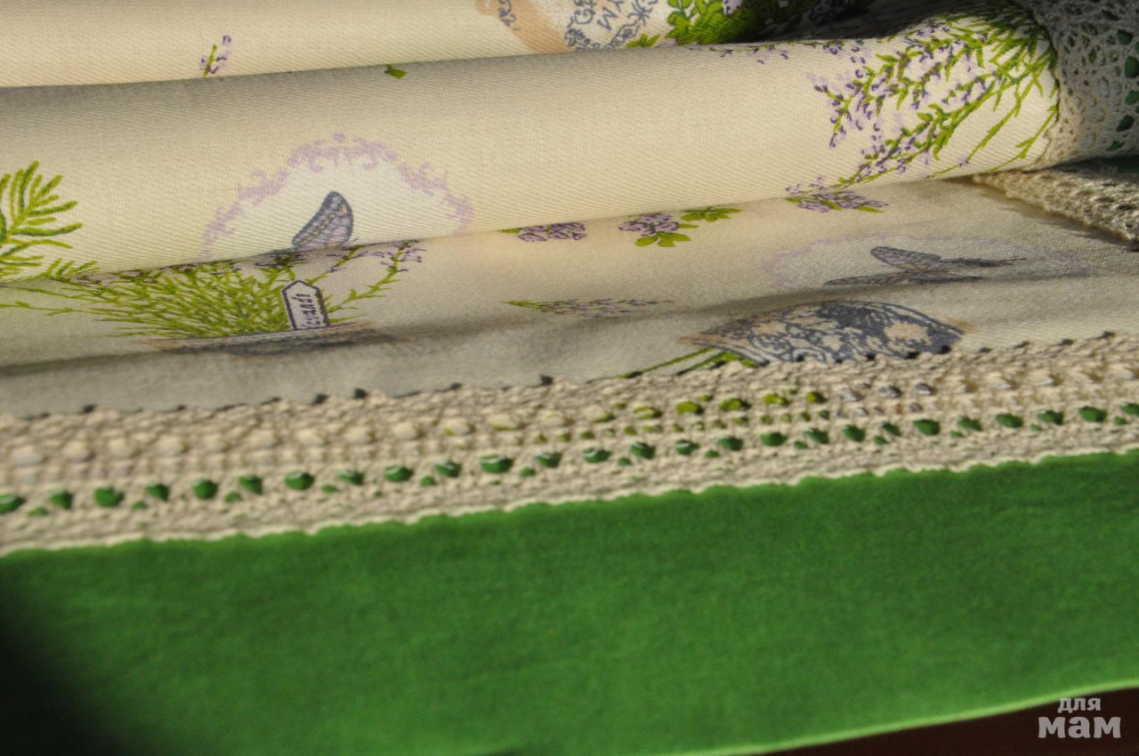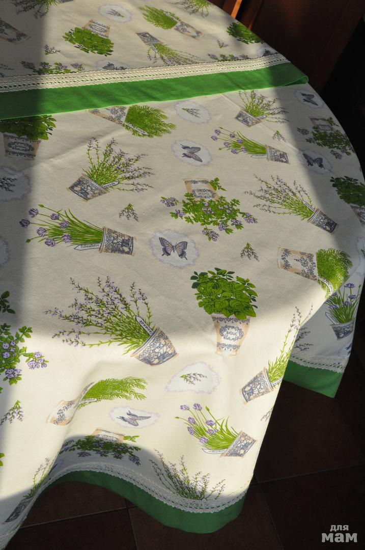 Скатерть с насыщенной зрелой, сочной, зеленой каймой напоминает летнюю траву, горшочки с лавандой и розмарином, фиолетовые бабочки как будто летаю по скатерти, по краю каймы хлопковое кружево все это придает вашему столу, уют и красоту.