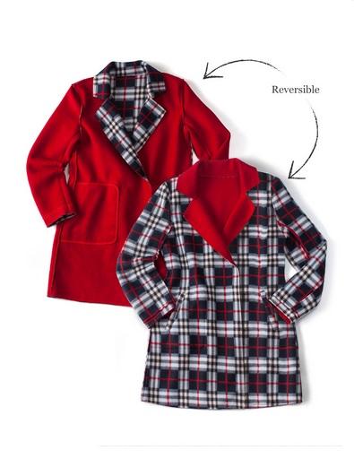 двустороннее пальто из дублированной ткани, созданной путем склеивания ярко-красного драпа и невероятно мягкого флиса в стильную клетку.
