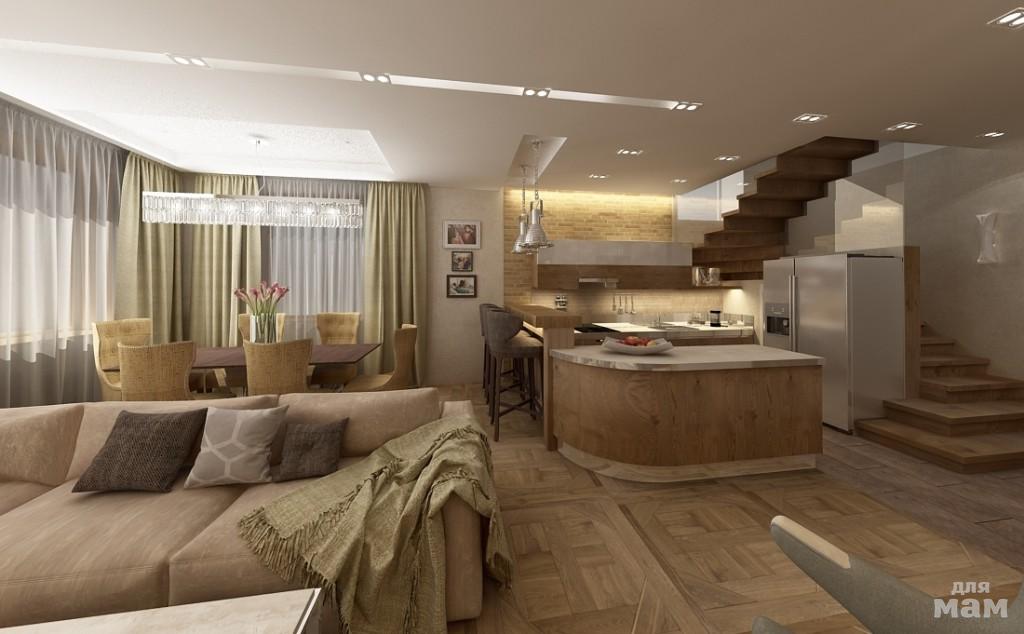 Идеальный вариант, к которому мы пришли в нашей практике, — это когда на первом этаже прихожая, гостиная, кухня и санузел; на втором — детская, гардеробная и кабинет или спальня; на третьем — спальня и вторая гостиная по интересам (кальянная, спортзал, бильярдная, домашний кинотеатр) — то есть те места, которые фактически посещаются один раз в день.