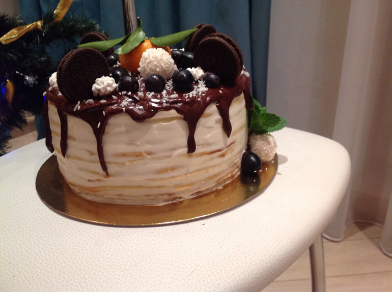 Р.S. Забыла написать, если коржи печь заранее, то их обязательно на время хранения нужно проложить пергаментной бумагой, а то коржи слипнуться.