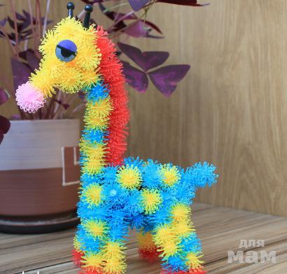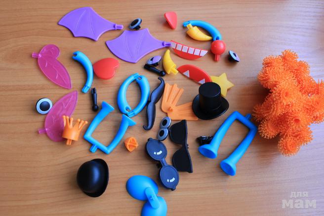Конструктор состоит из разноцветных шариков-липучек, которые отлично скрепляются между собой за счет маленьких крючков. Кроме липучек в наборе есть различные аксессуары — ножки, ручки, глазки, очки, усы, корона, сердечко и так далее. В каждой липучке есть отверстие, туда прикрепляем аксессуары. Они вставляются в липучки довольно-таки крепко, но это лучше, чем если бы они не держались и выпадали совсем.