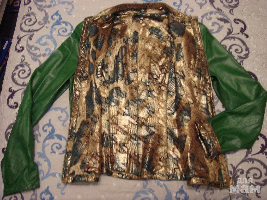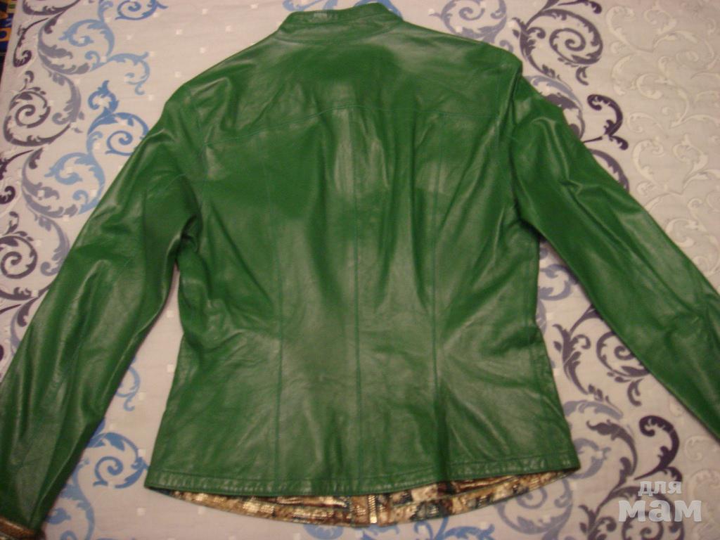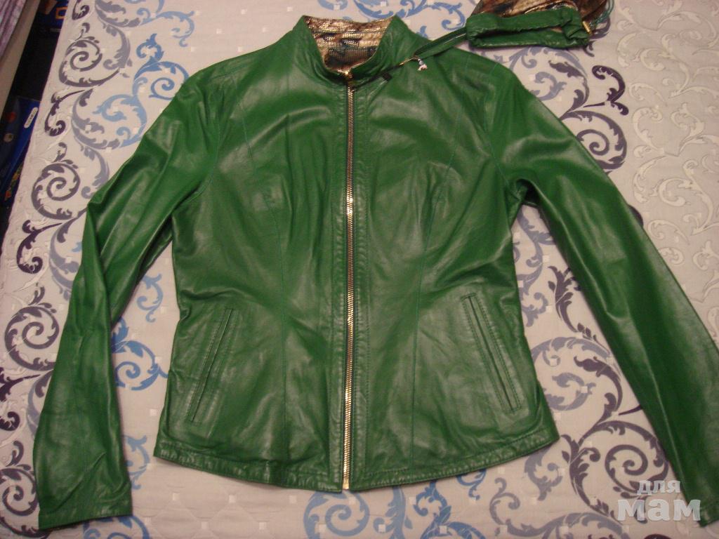 Куртка из натуральной кожи. Новая с ценником. Кожа мягкая не толстая. Очень приятная. Цвет молодой травы- зеленый. Молния золотого цвета. куртка двусторонняя, на изнаночной стороне еще одна пара карманов. Смотрится элегантно. упакована в мешочек.