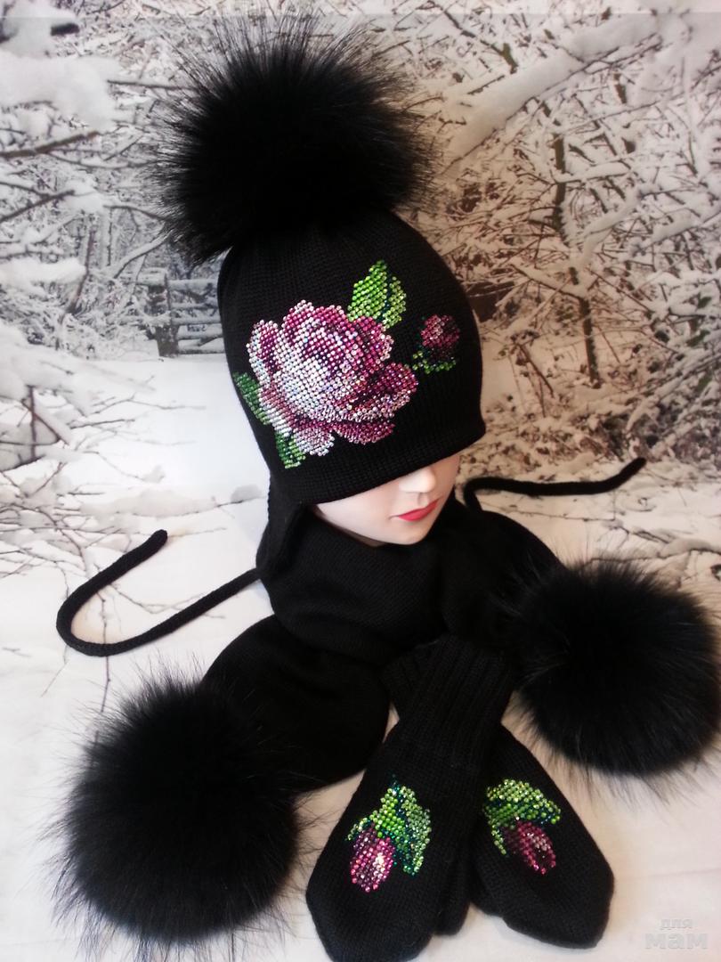 Вяжу на заказ шапочки с ручным декором из страз под любые курточки, пальтишки, коминезончики