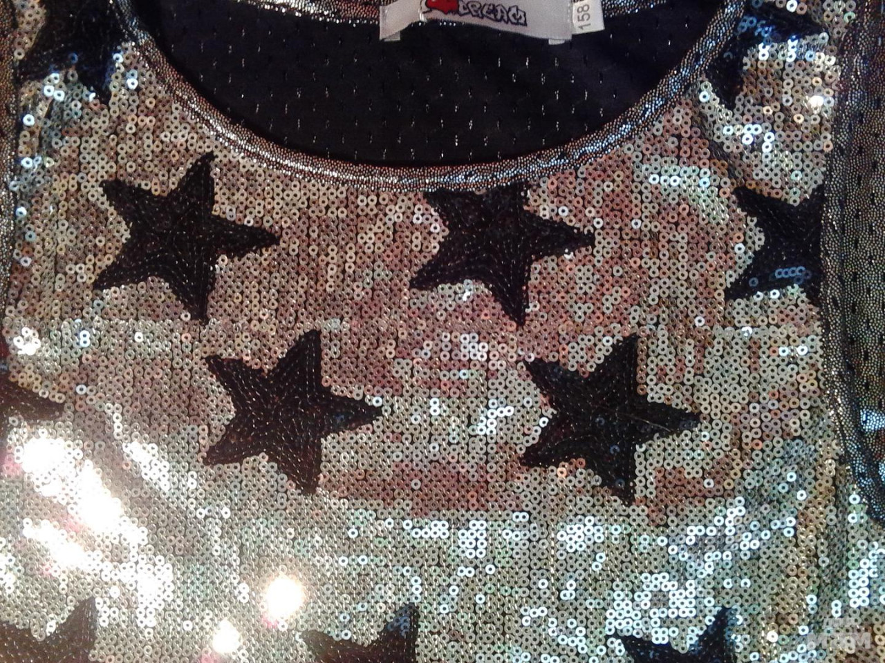 Майка со звездами р 158. Оч понравилась дочке, но... Маломерит на размер... подойдет девочке ростом 152. 760р 600р из-за "брака" ("Брак" - ряд пайеток "съехал" на другой ряд.)