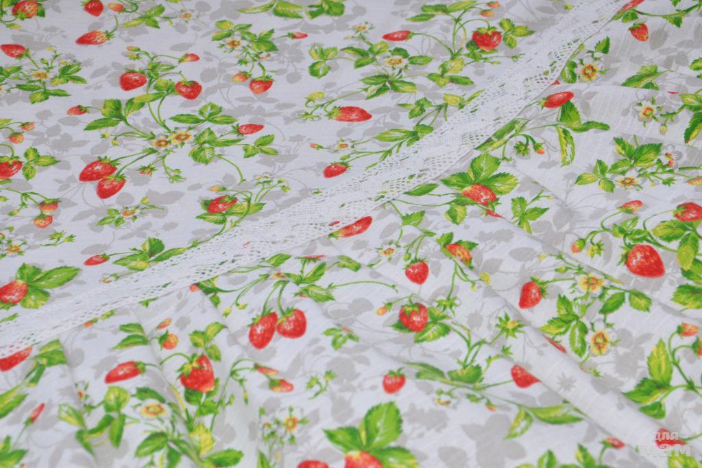 Ярко- красные ягодки в зеленых листьях, даже не зеленых, а смесь цветов: зеленый, желтый, салатовый. Белые цветочки и еще совсем не дозрелые ягодки с розовыми боками, которым осталось чуть- чуть дозреть. На белом фоне присутствуют тени маленьких кустиков земляники, что дает более насыщенный рисунок ткани.