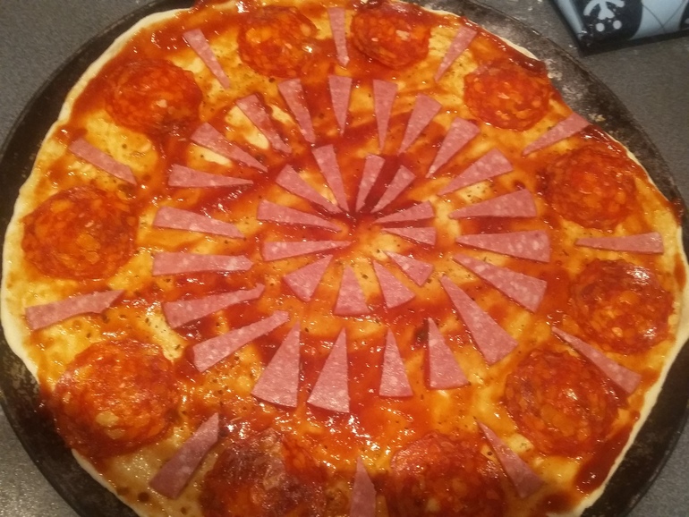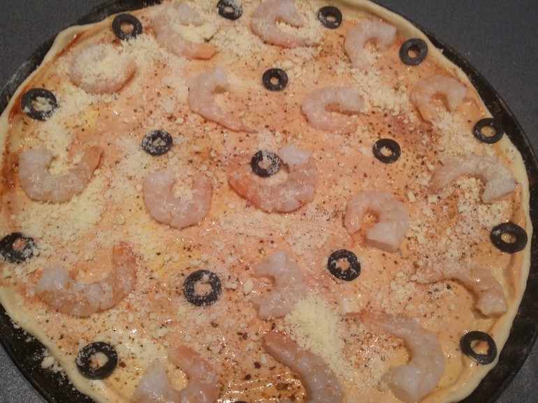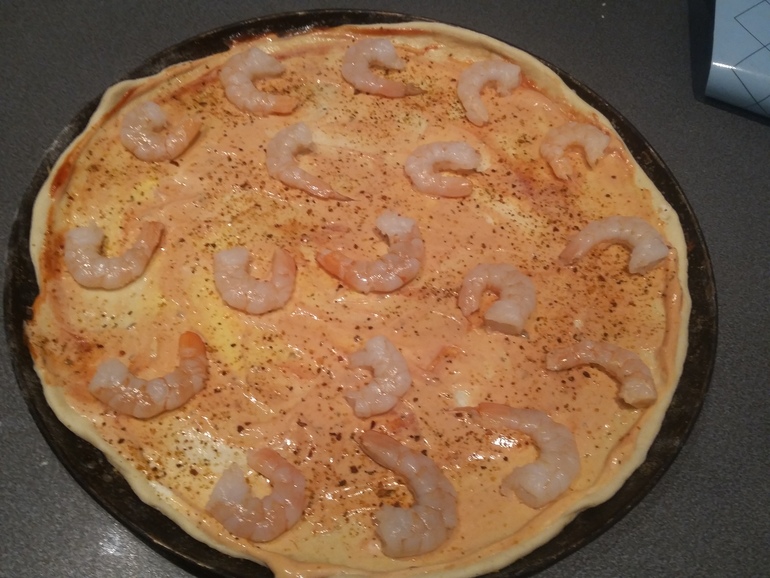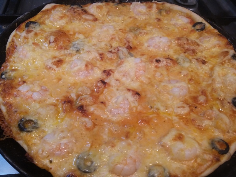 В этот раз настроение было на пиццу из креветок, разноколбасную, со свининой.