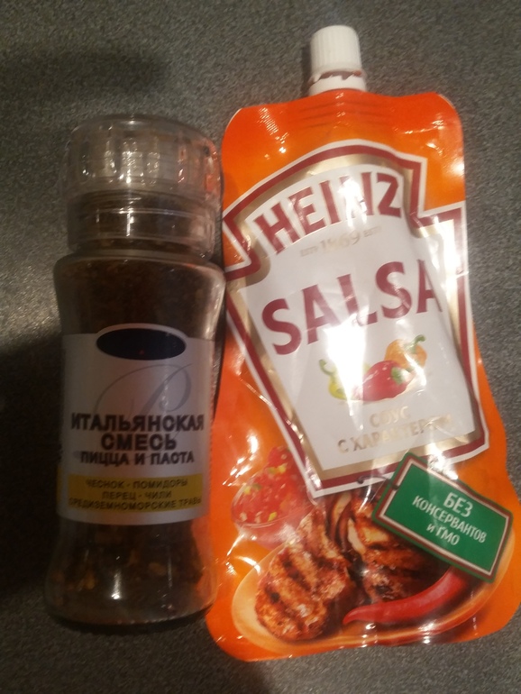 Про тесто писала много раз (смешать 1 чашку теплой воды, 2 ст.л. оливкового масла, щепотку соли, муку, дрожжи). Без расстойки раскатать.Смазать смесью кетчупа и коктейльного соуса, посыпать приправой для пиццы: