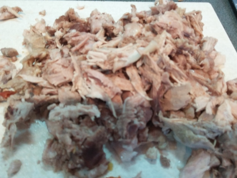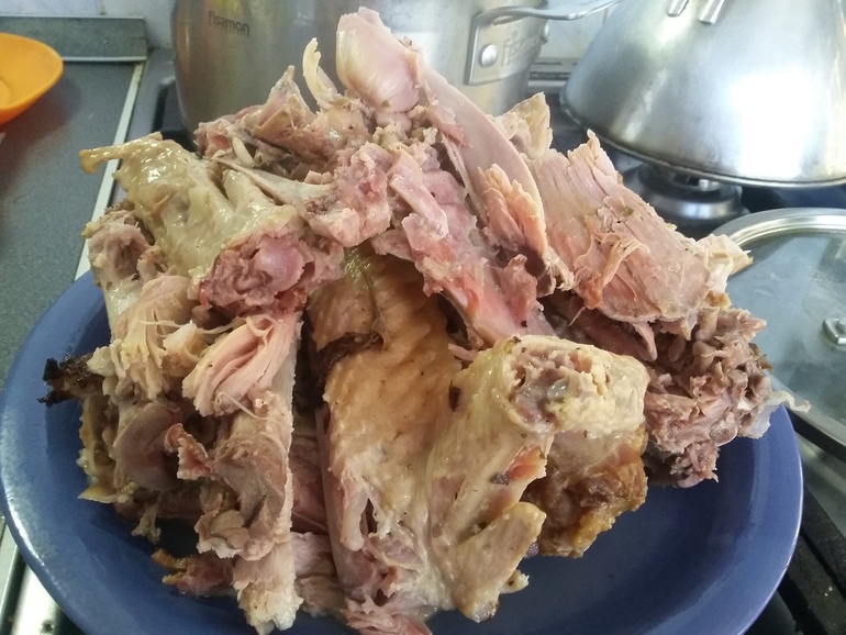 Проварить еще 10 минут. Вытащить все кости из кастрюли. Отделить мясо и вернуть в бульон: